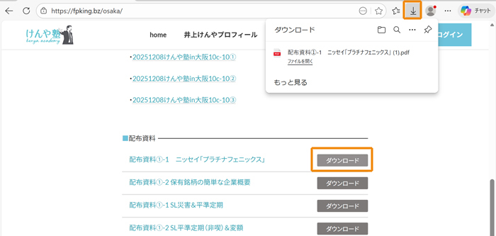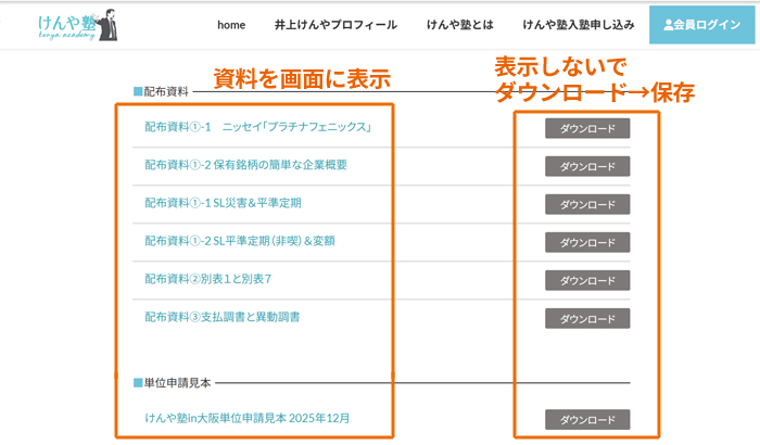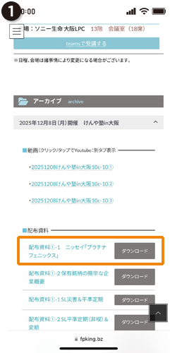配布資料と単位申請見本のpdfは会場ページのアーカイブ>該当講義開催日の資料名またはダウンロードボタンからダウンロードが可能です。